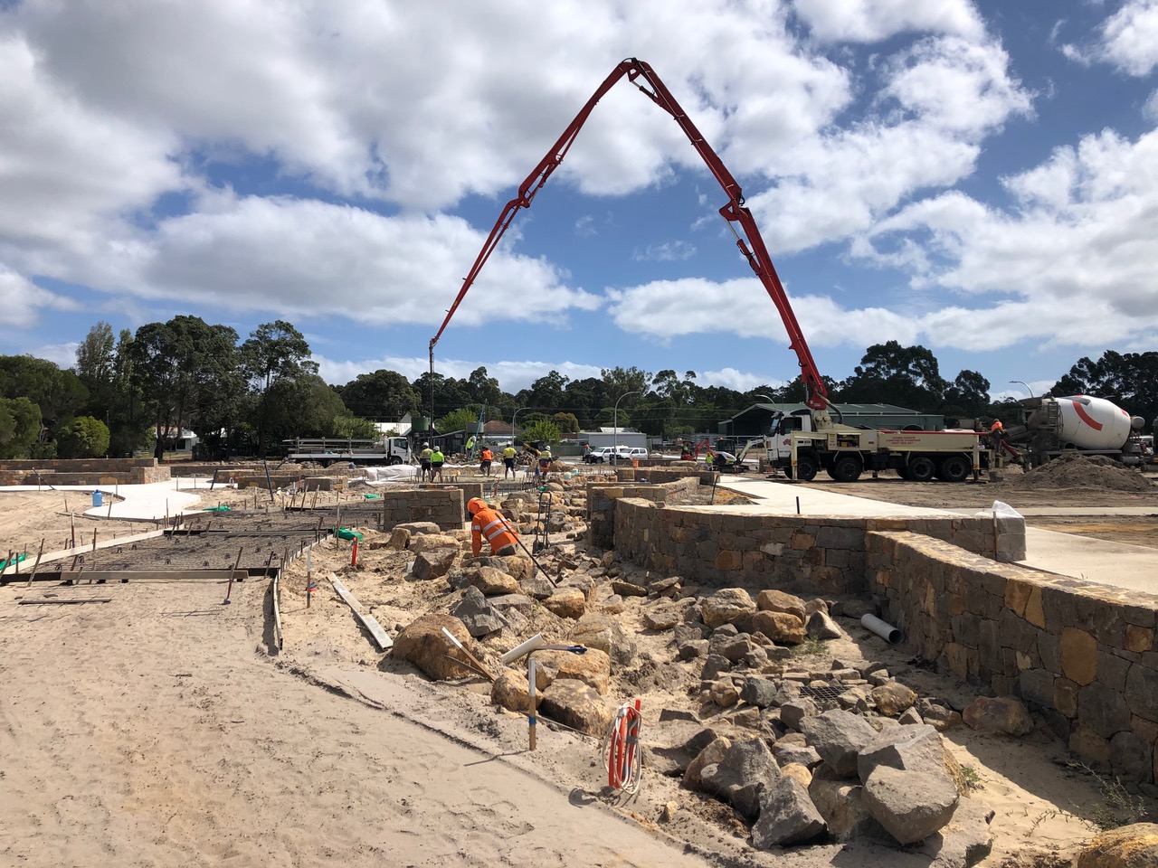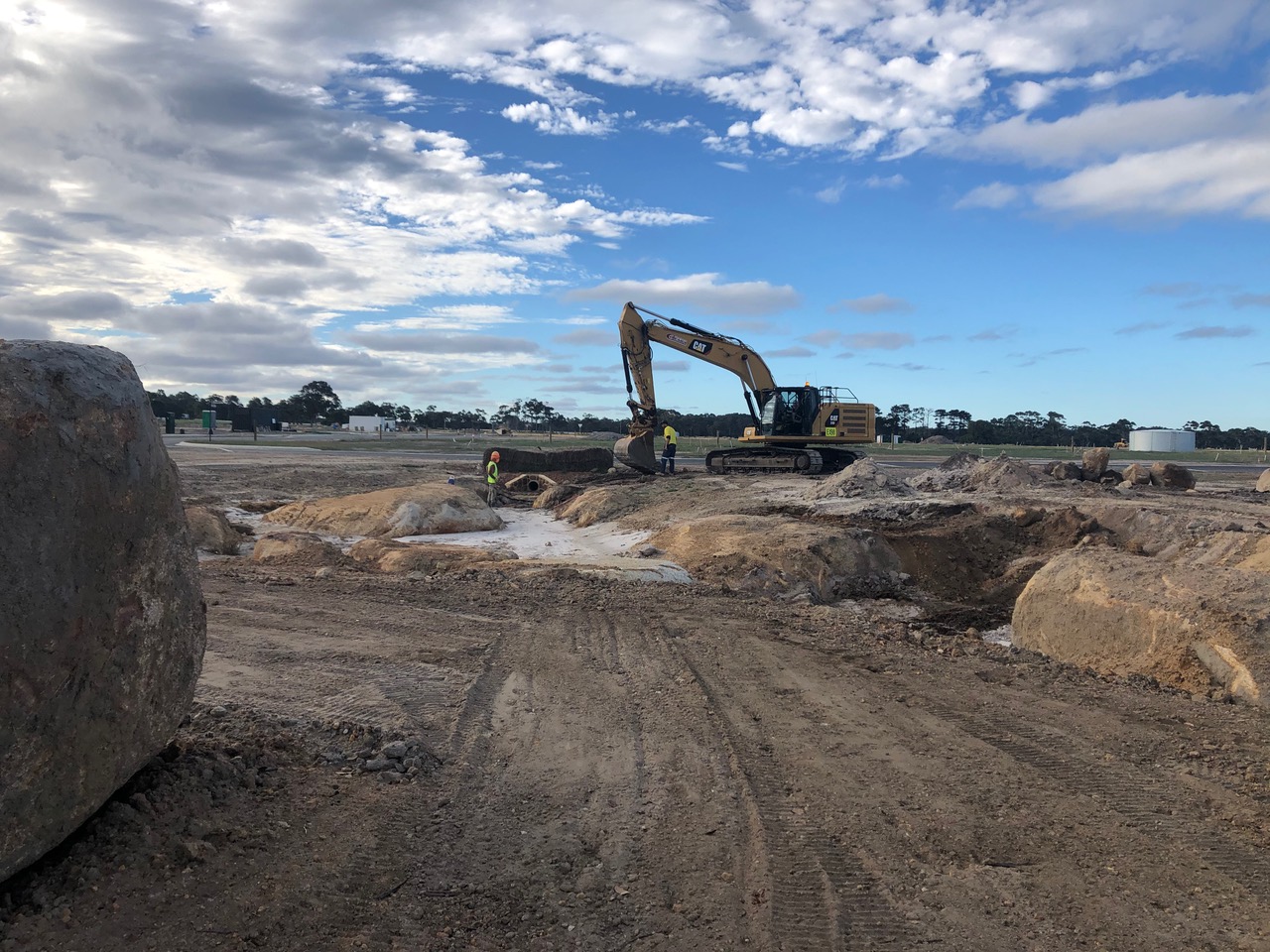 The drainage basin behind the oval features some massive granite boulders that were unearthed when we were constructing the sewerage system. After breaking a couple of rock breakers, we decided it would be better to redesign the sewers and to incorporate the boulders as part of our stormwater treatment system.The oval has been given a final trim to level, compost has been mixed into the sand fill and irrigation pipes have been installed ready for turf to be planted in late April.