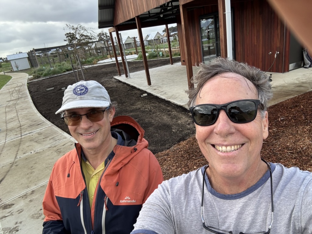 This year, it was the time for the Stage 4 clusters (4A and 4B) to take over management and enjoyment of their cluster gardens and meeting sheds – this was great timing, with 15 occupied homes and a further 10 homes underway in the clusters. On Friday 27th June, Mike met with owners from both clusters and spent a number of hours explaining the infrastructure, answering questions and celebrating the milestone! It was a very special handover for Mike this time, as he had personally gotten on the tools (shovel, bobcat, irrigation, etc.) in the sometimes inclement weather over a three week period (with local Ecovillage landscaper Nathan from Brightstar) to prepare and install the large picnic lawns in both clusters, completing the landscaping around the meeting sheds.