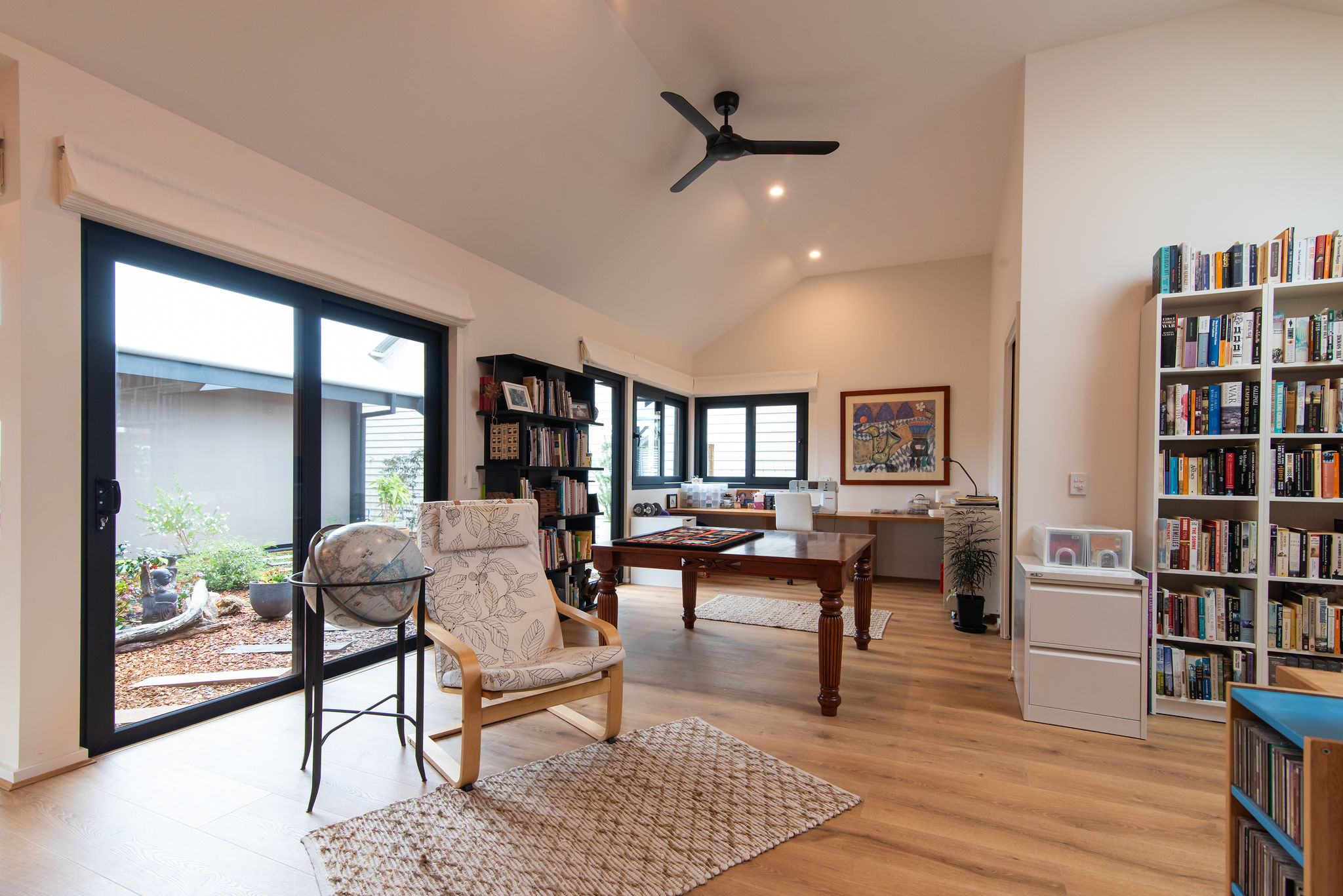 - Spacious, multi-purpose activity room / office with built-in furniture, high ceilings, and skylight, opening to an internal landscaped courtyard