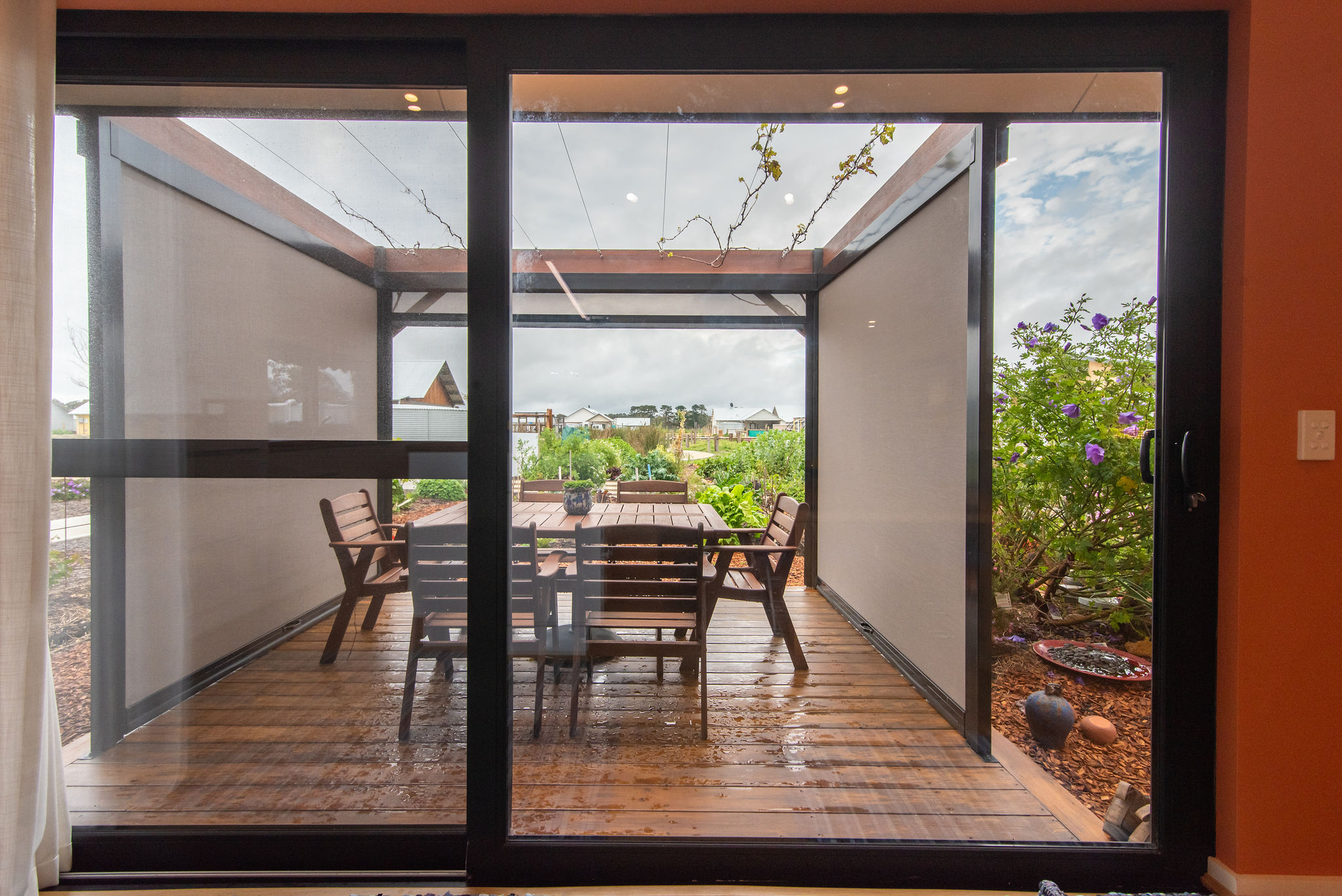 - Two covered alfresco timber decks (north and east) with Ziplock retractable UV blinds for sun and wind protection