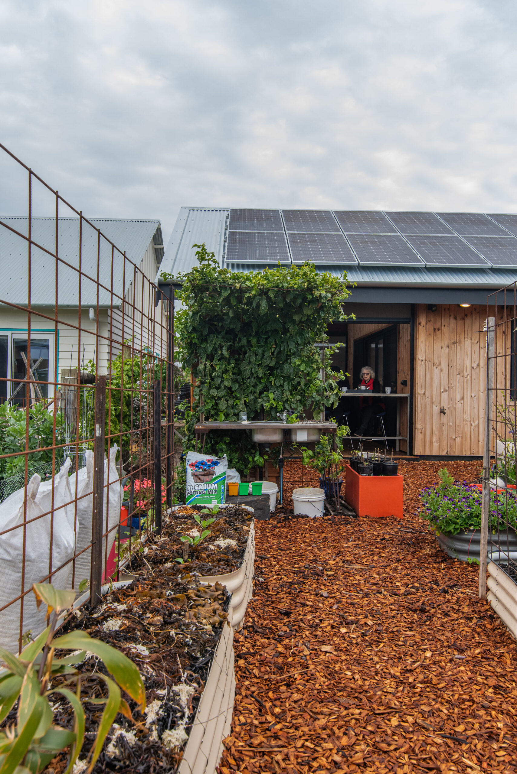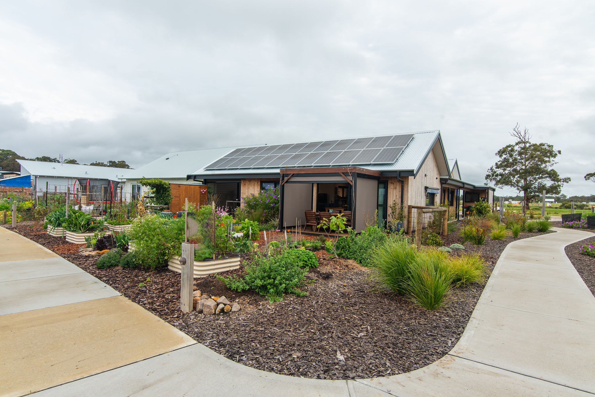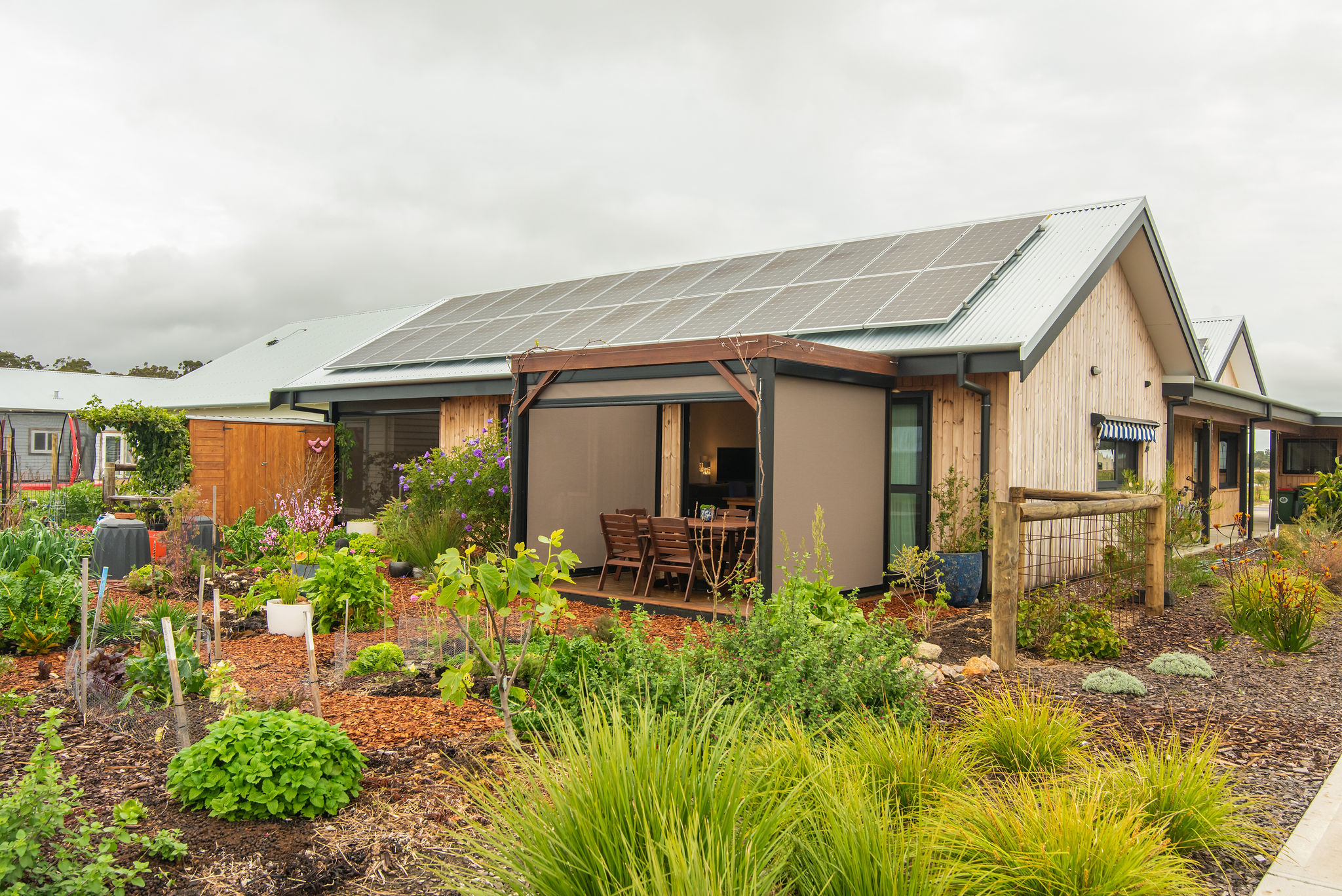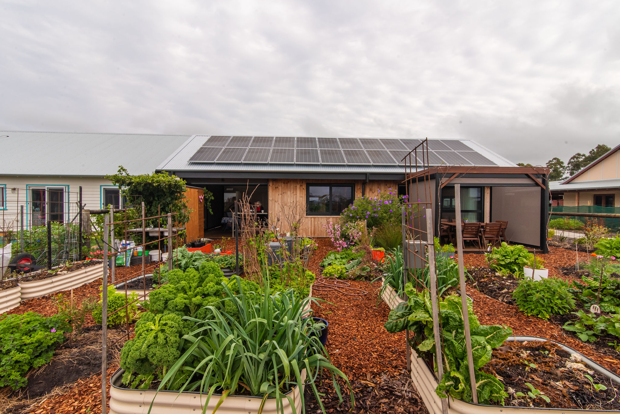 Nestled alongside a central footpath that provides open space on the west, the home is flanked by lovingly tended gardens of pure delight and abundance. The magnificent vegie patch on its 115sqm of Exclusive Use Area within the shared community garden is a favourite pitstop on the Ecovillage sales tour. A model garden overflowing with flowers, fruit trees, vegetables and greenery, it is admired (and envied) by all who walk past.