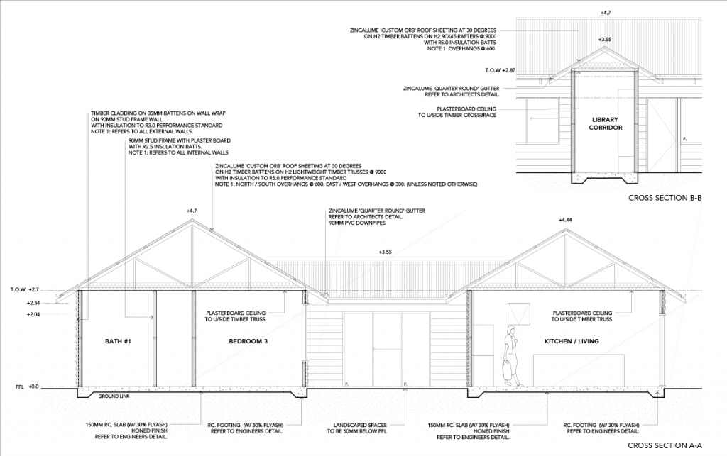 Sun shine on! By splitting the house volume into a separate living pod and sleeping wing linked by a library walkway, The Pavillions maximises its northern solar exposure and opportunity for cross ventilation, bringing glorious light and sea breezes into your home. The result is naturally well-lit living spaces with two courtyard patio areas adjoining three bedrooms to encourage alfresco living and a seamless connection with the landscape.