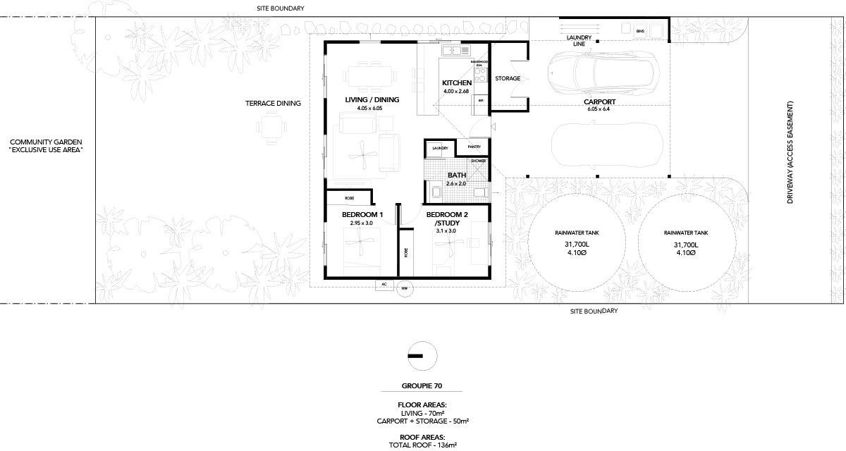 As the minimum roof catchment area for the 2-bedroom Pioneer is 150sqm and the base plan only provides 138m2 of roof area, an additional 12m2 of roof catchment must be provided to meet our water provision requirements.