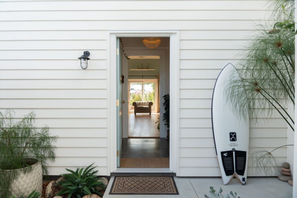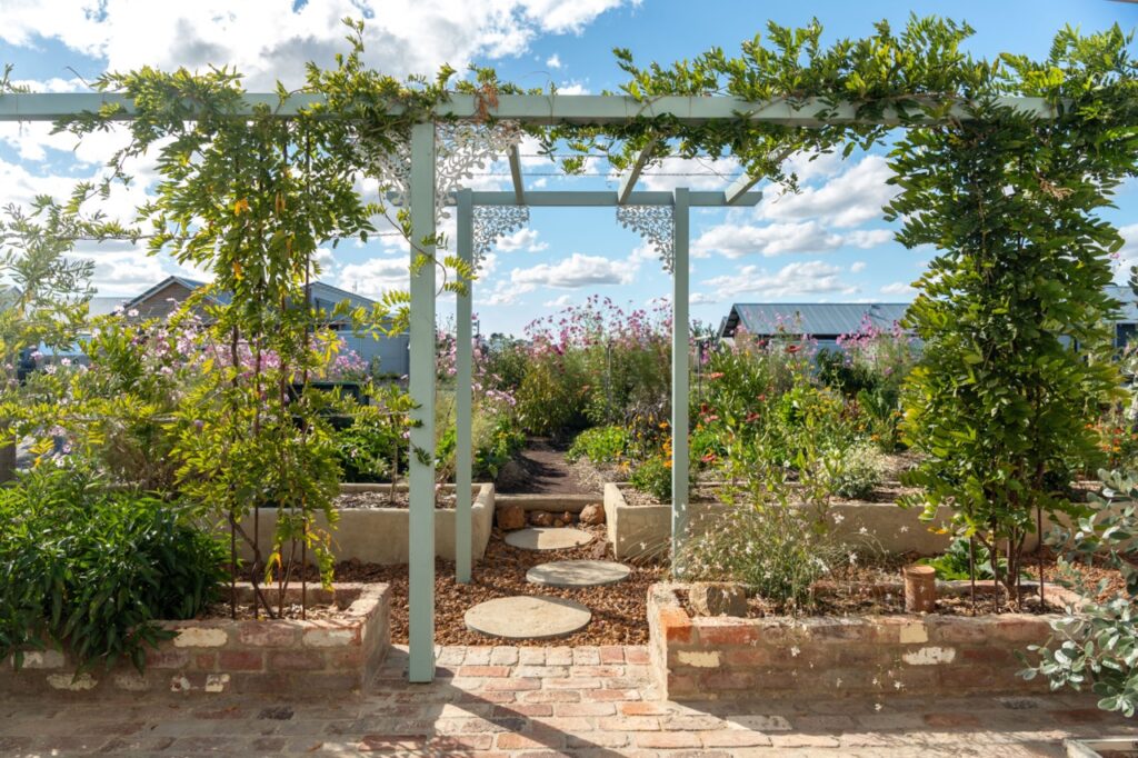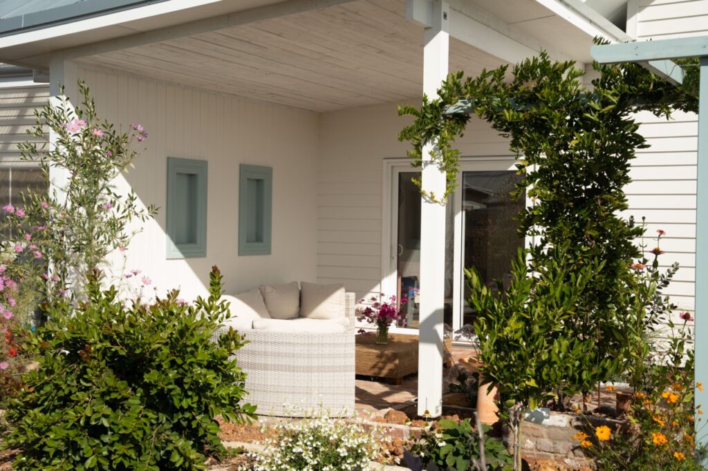 Entering from the street over a little bridge and through a rustic gate, a recycled brick path directs you through the neat and productive waterwise courtyard garden, with fruit trees, natives and abundant flowers, past the home’s shaded outdoor entertaining area to the generous front sliding doors.