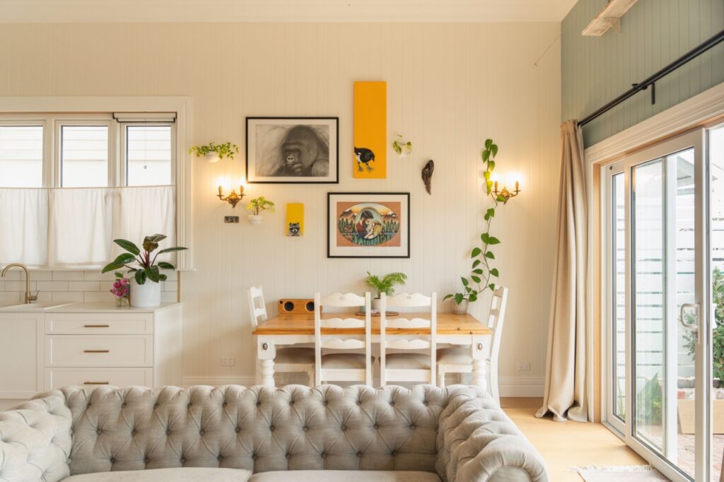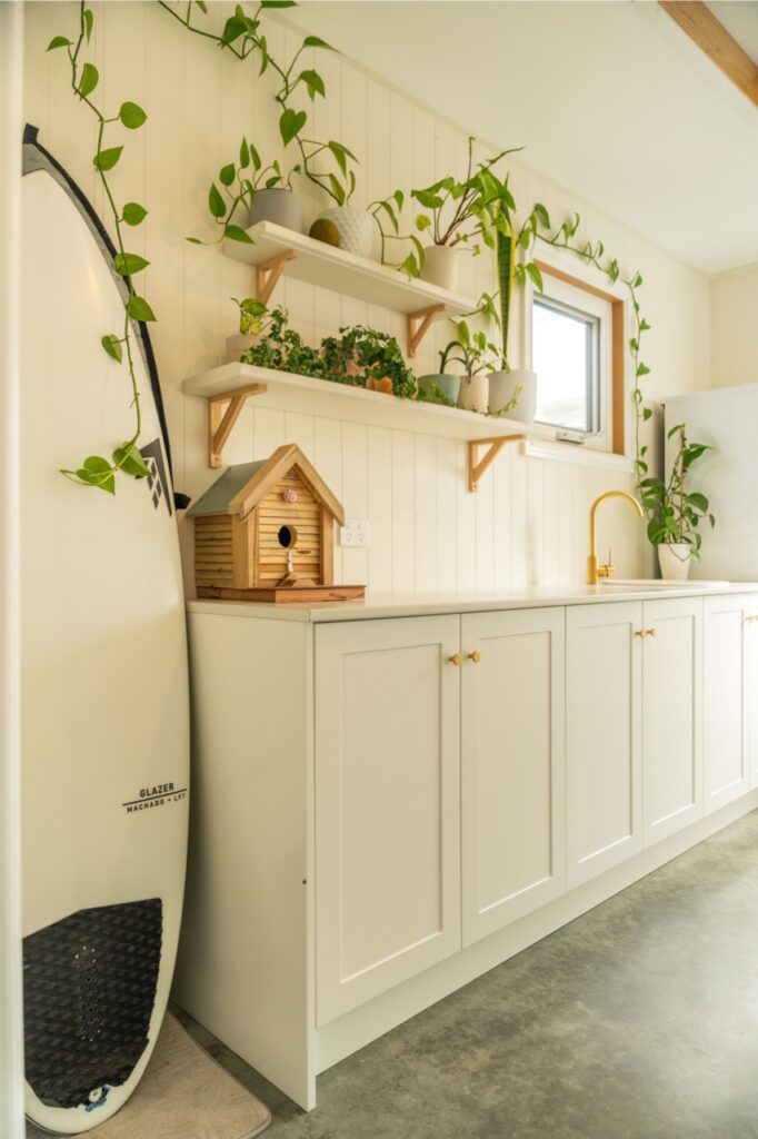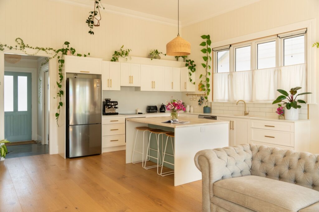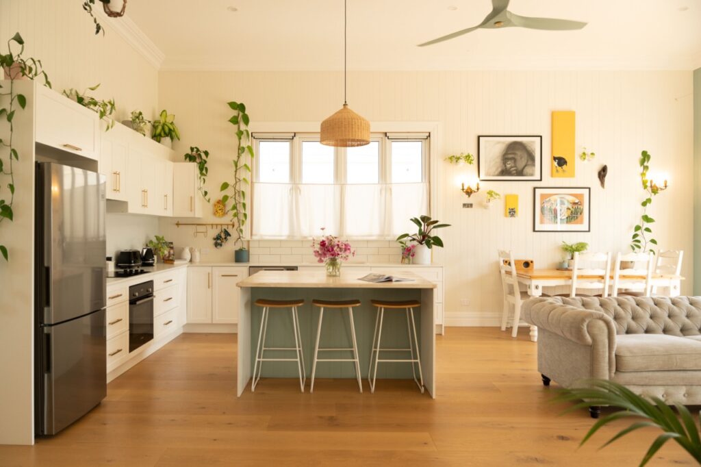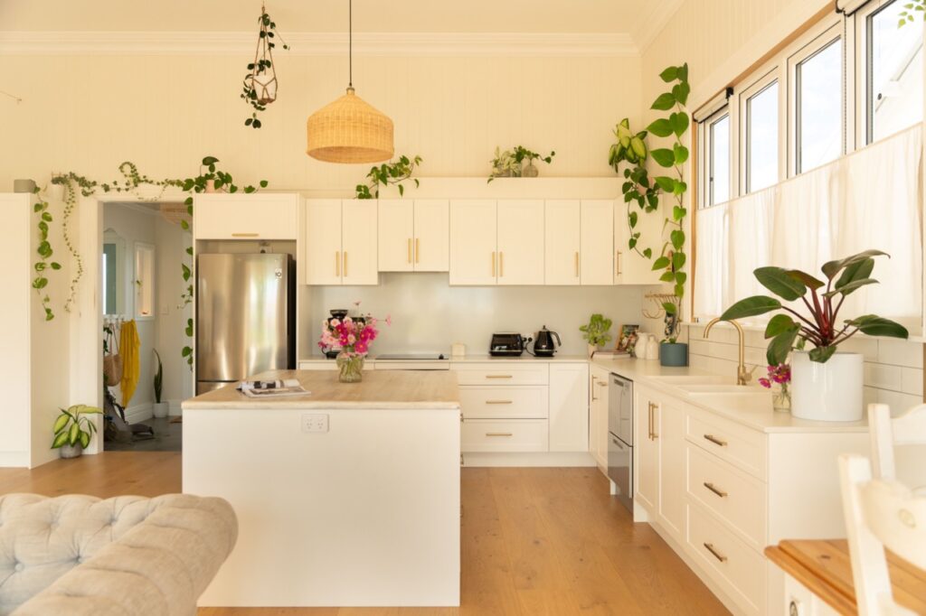 Inside, the welcoming open plan kitchen, dining and living space is set apart by its 3.6m high ceilings, painted timber panelling and beautiful engineered European oak flooring, with plenty of space for relaxing, entertaining and family life. The kitchen is light, bright and sunny, with abundant storage, quality Bosch and Fisher and Paykel appliances, brass fixings and a charming recycled Douglas Fir island bench and breakfast bar. The kitchen has neutral tones with white painted full height cupboards, stone look Laminex benchtops, porcelain sink, and brass tapware. Shelves placed high around the living room walls add extra ambience, with the owners’ stunning collection of indoor plants and art on display.