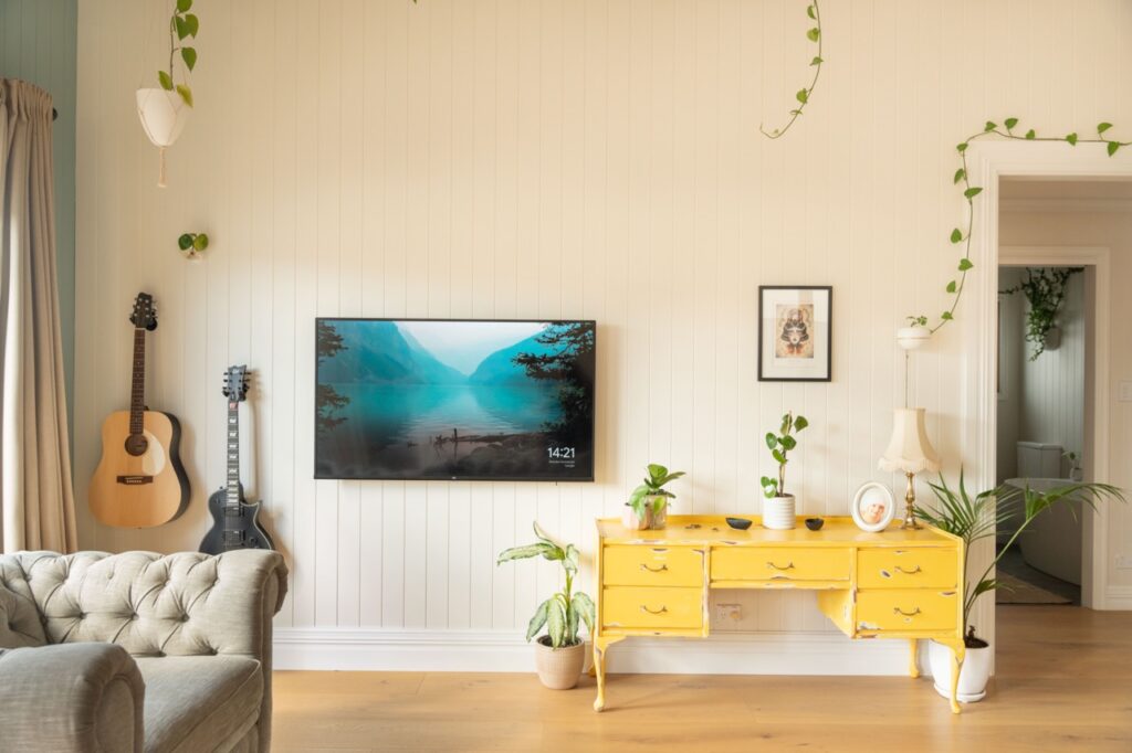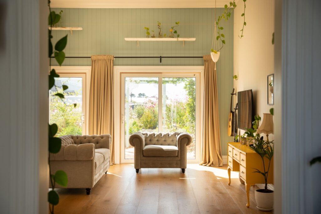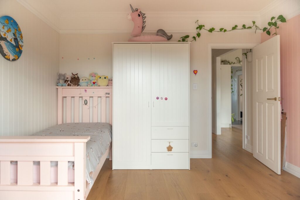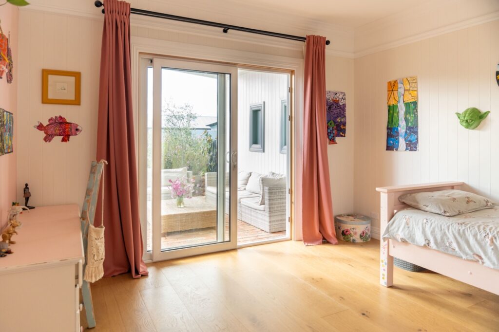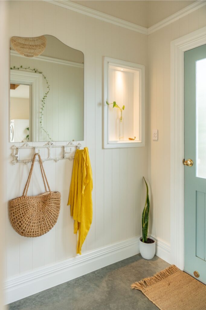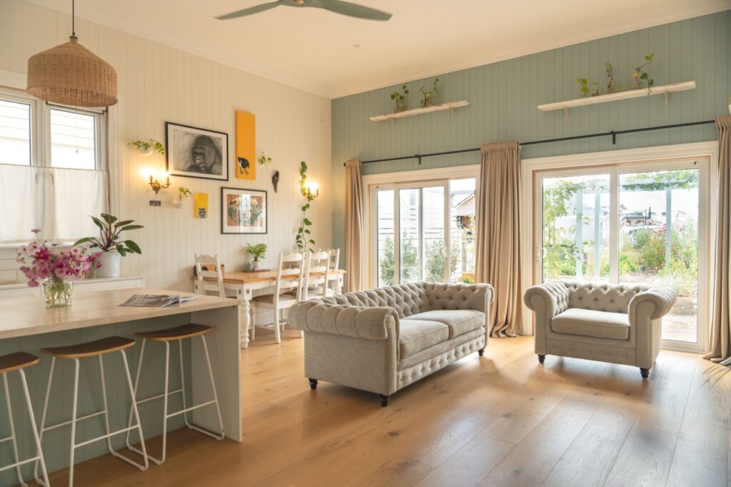 Inside, the welcoming open plan kitchen, dining and living space is set apart by its 3.6m high ceilings, painted timber panelling and beautiful engineered European oak flooring, with plenty of space for relaxing, entertaining and family life. The kitchen is light, bright and sunny, with abundant storage, quality Bosch and Fisher and Paykel appliances, brass fixings and a charming recycled Douglas Fir island bench and breakfast bar. The kitchen has neutral tones with white painted full height cupboards, stone look Laminex benchtops, porcelain sink, and brass tapware. Shelves placed high around the living room walls add extra ambience, with the owners’ stunning collection of indoor plants and art on display.