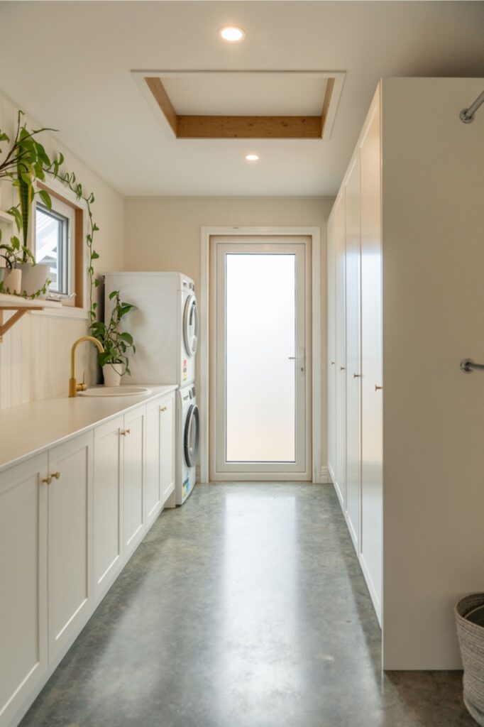 - Burnished concrete entry hallway, bathroom, laundry