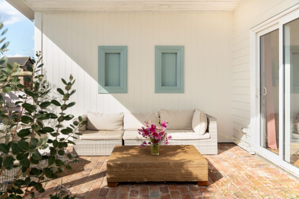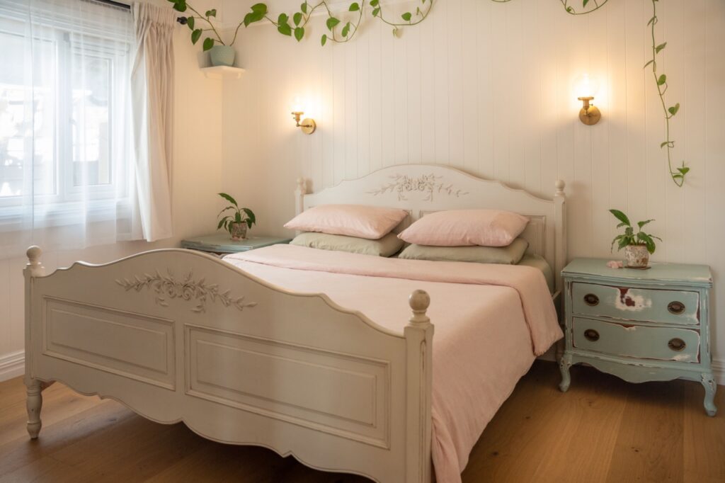 To the east of the home, a hallway leads to the 2 bedrooms, the master bedroom at the rear with built in robes, and the secondary bedroom or study leading north through sliding doors to the garden. The cosy bedrooms are separated by the character bathroom with an upcycled duck egg blue washstand, separate enclosed glass shower recess, luxurious deep oval bath, and imported brass tapware. The duck egg blue motif is repeated subtly throughout the home and outdoor living area, adding to the country cottage feel without overpowering the otherwise neutral palette.