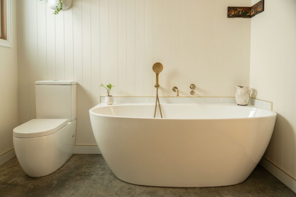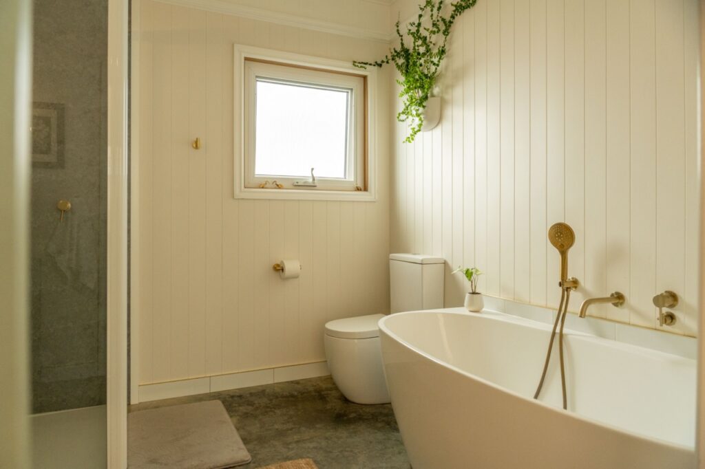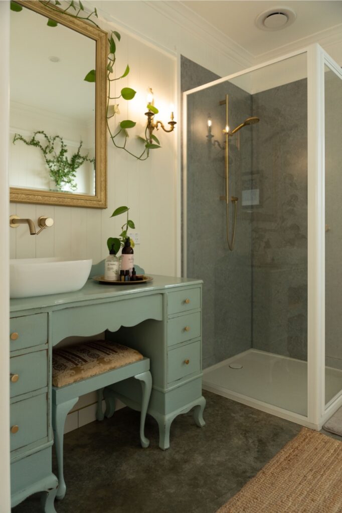 - Stylish bathroom with unique upcycled vanity, imported brass fittings, stunning deep oval bath, separate shower and enclosed glass recess