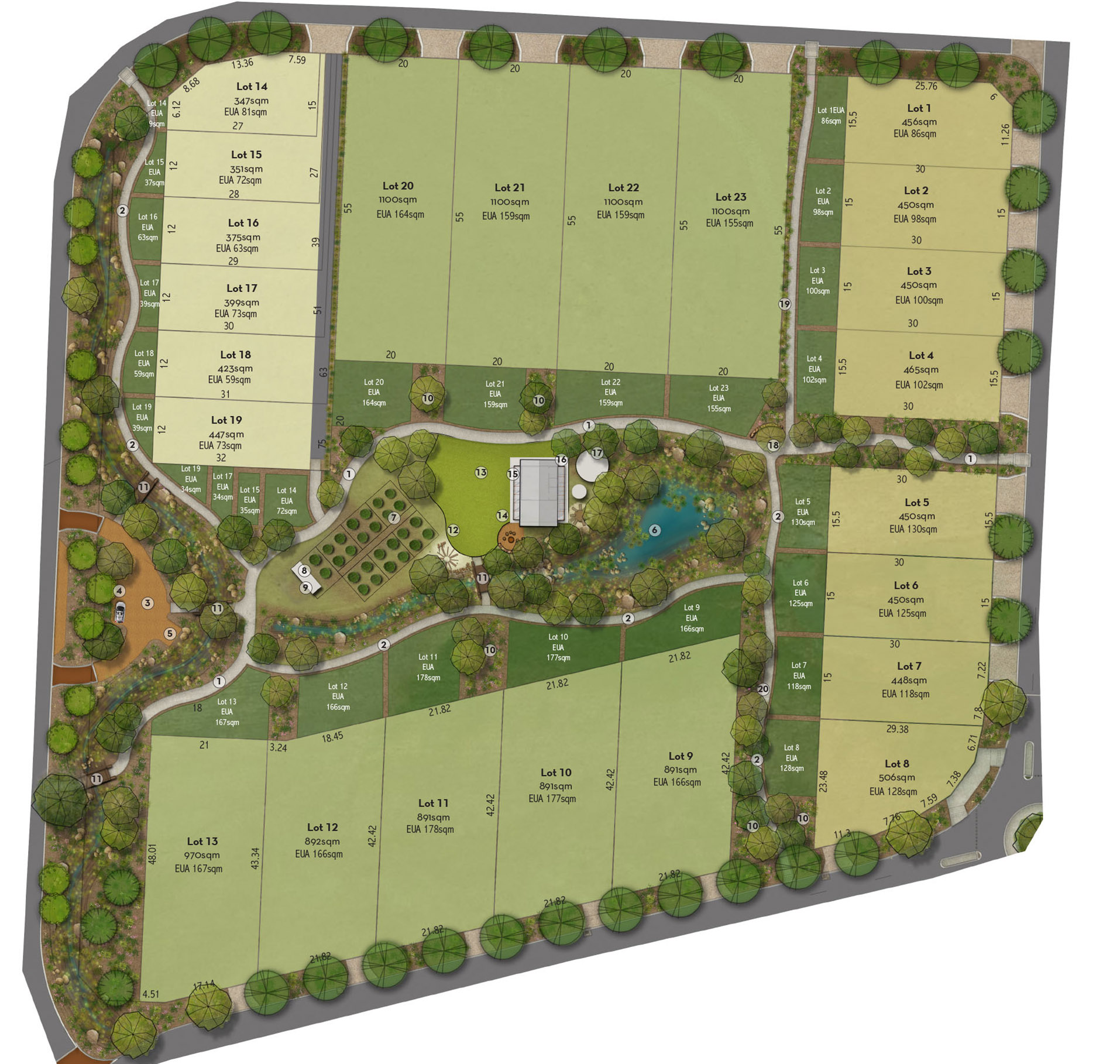 Click on individual lots to reveal pricing, size and dimensions, plus Exclusive Use Garden Area and total area in sqm (lot + EUA). Simply hover over the blue tooltips along the trail to reveal the treasures within the cluster community garden.