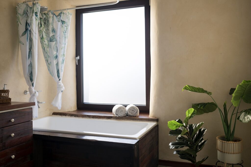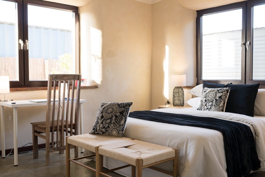 You will be immediately impressed by the lofty ceiling heights and generous, flexible living spaces of this beautiful home, as well as the quiet and peaceful ambience created by quality double-glazing and the deep earth-rendered walls. It’s hard to beat strawbale as an eco-friendly, thermally comfortable building material – there is nothing else quite like it!