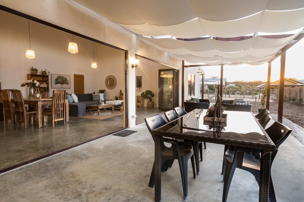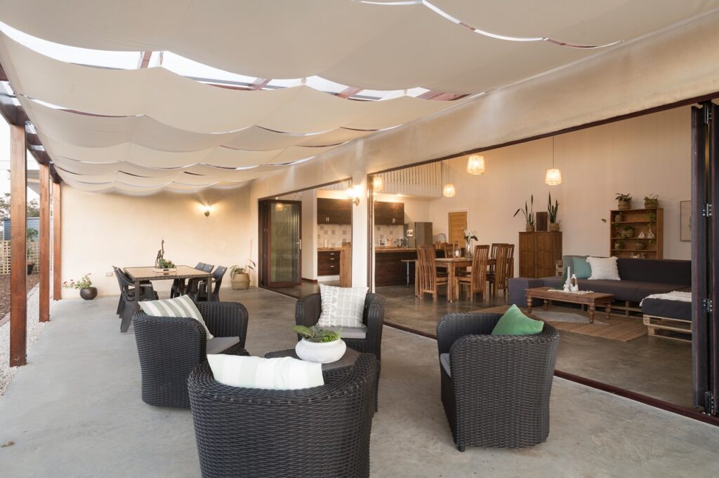 - Timber patio covered in Sunpal sheeting with bespoke retractable shade sails