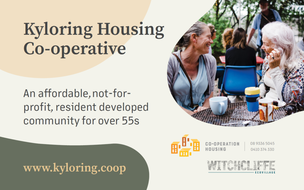 This workshop provides a clear overview of the co-operative housing development process for Kyloring Housing Co-operative and comes strongly recommended for anyone interested in calling this co-op home. Free info sessions where you can learn more about the project are held online, in Perth or in Witchcliffe.